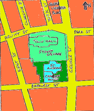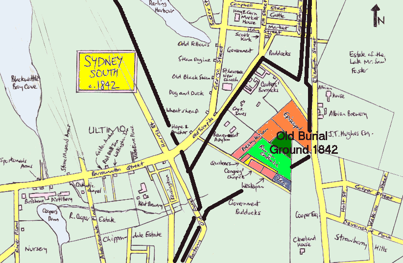 An old map of 1836 shows the "Old Burial Ground" adjacent to St Andrews, fronting George Street, with the back boundary parallel to George at the south end, then a corner cut off at Druitt Street. On my crude map (right) the cemetery covered the area coloured light green.